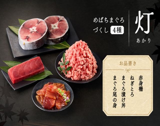 「めばち鮪づくし灯」 「まぐろの尾の身」と、「まぐろの赤身サク」、「ねぎとろ」 さらに「まぐろ漬け丼の素」を、セットにしました。 太平洋で捕獲し、船内で急速冷凍された新鮮なマグロ 三浦三崎港に水揚げされ、そのまま弊社工場で加工しました。 捕れたての鮪をご堪能下さい。