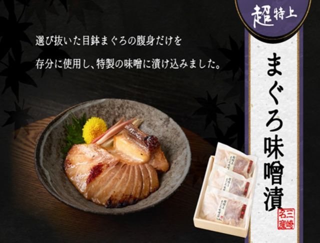 厳選した目鉢まぐろの腹身だけを使い、 特製の味噌に漬け込みました。 口の中でとろける程の柔らかさを感じて下さい。